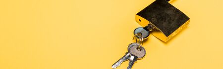 panoramic shot of metallic padlock with keys isolated on yellow