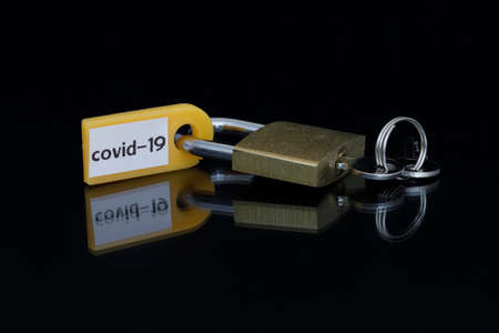 closed padlock with keys on a yellow background at the bottom the inscription closed laid out from the keys of a computer keyboard concept prohibitions data protection. High quality photo