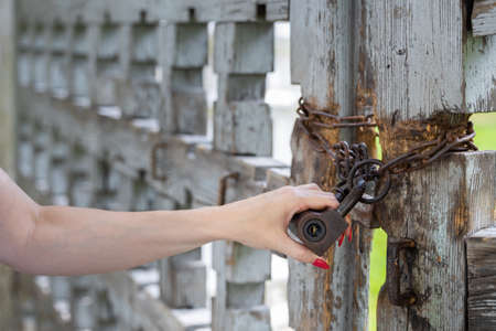 hand pulls the lock on which the gate is closed. high quality photo
