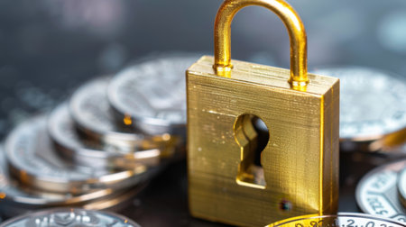 A golden padlock stands prominently among digital coins, representing security and protection in cryptocurrency transactions, emphasizing financial safety and technological trust.