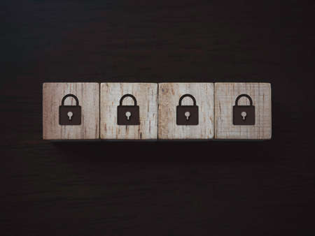 Privacy and personal data protection concept. Four lock icon on wooden blocks on dark wooden background, top view. Password security.