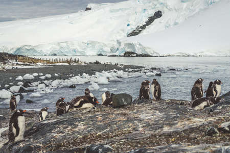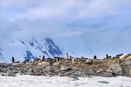 Gentoo penguin colony on Danko Island on the Antarctic Peninsula in Antarctica.