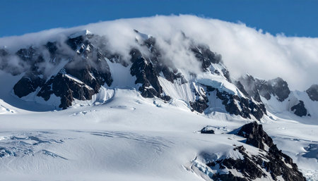 Clouds embrace the rugged summit of a majestic mountain, shrouding its icy peaks in mystery.