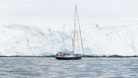 Sail boat in Antarctica waters. Antarctic Peninsula