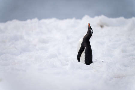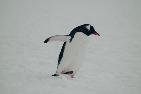 Gentoo penguin walking in the snow on Cuverville Island in Antarctica