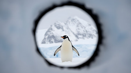 A Gentoo penguin standing on white snow with snowy mountains in the background, viewed creatively through a dark circular frame or hole.