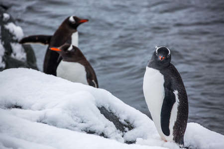 Beautiful gentoo penguin on the snow in Antarctica. Close-up