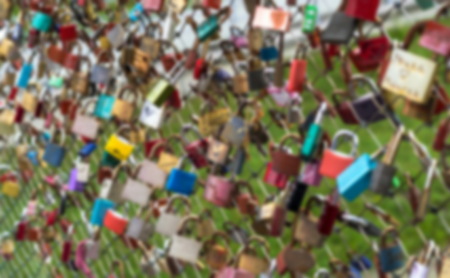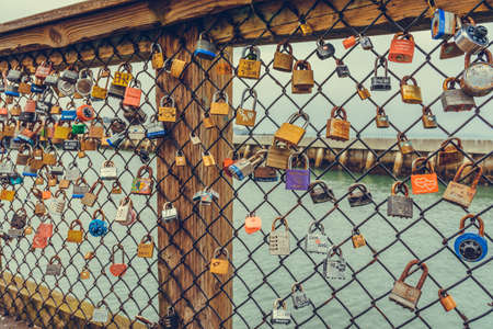 Many Love locks on fence symbol of eternal love, friendship and romance.