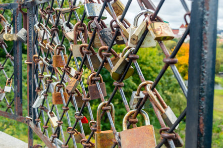 Group of old rusty locks closed during theier marriages as a symbol of eternal love and matrimonial promises.