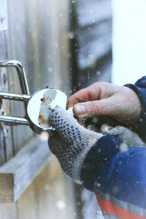 Close-up, the carpenter installs a custom lock in the front metal door, using a drill and hammer and other tools. 2020