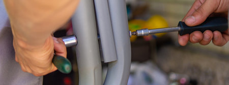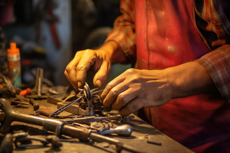 close-up of hand repairing a bicycle, tools in background, created with generative ai
