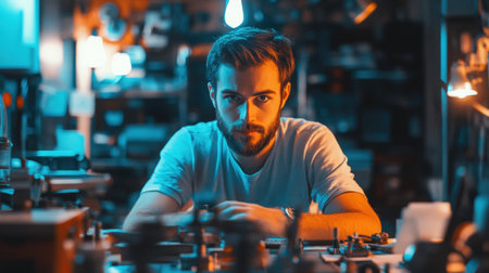 Engineer focused on tasks in a workshop filled with various tools and machinery, highlighting creativity and innovation in engineering design and technology