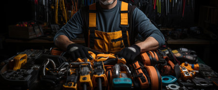 Male Caucasian Middle aged fixing appliances in garage workshop. Generative AI AIG23.