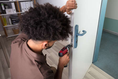 Close-up Of A Young Male Carpenter Installing Door Lock With Wireless Screwdriver