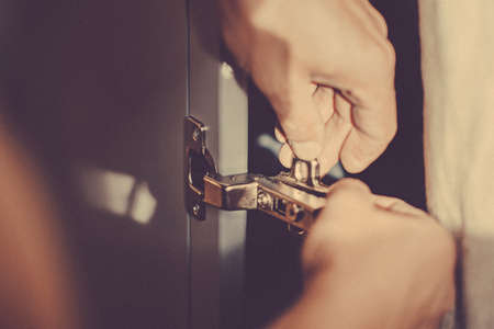 Joiner collects a new cupboard with a hand tool. carpenter collects a locker. Toned image. fastens the hinges of the cabinet door close
