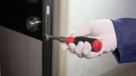 Screwdriver in hand, unscrewing the door lock, the carpenter repairs the interior door.