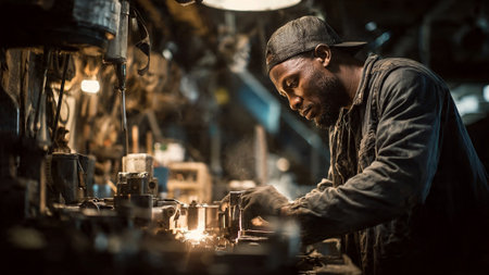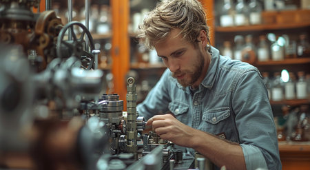 Focused craftsman repairing machinery in a vintage workshop setting.