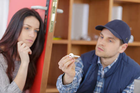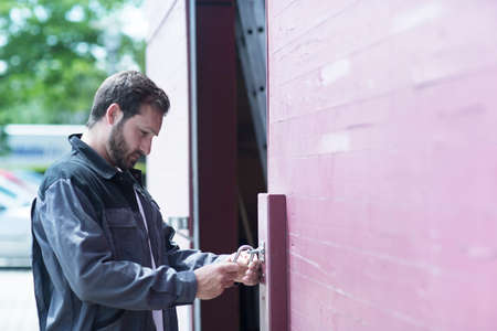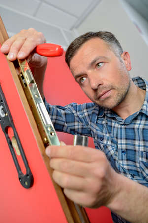 The master worker installs a door lock in the front door, metal doors with a polymer coating