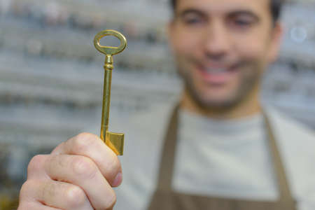 Male hand holding house key. Key in a hand. Unprotected data. Closeup key. Selective focus and shallow Depth of field.