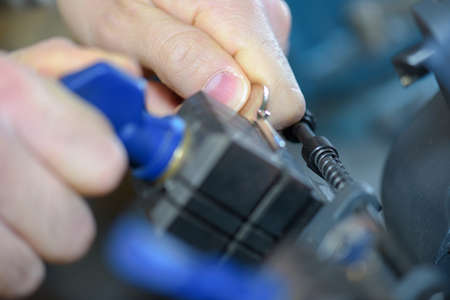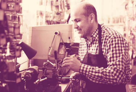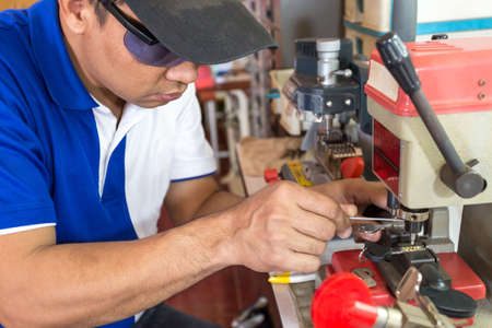 Locksmith in workshop makes new key. Professional making key in locksmith. Machine production of duplicate metal key.