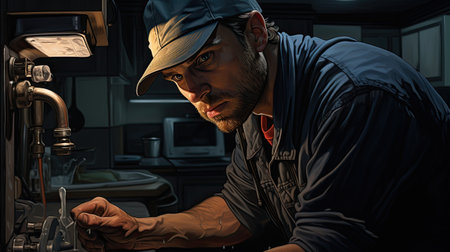 Side profile silhouette of a person repairing plumbing under a kitchen sink, lit by harsh sunlight.