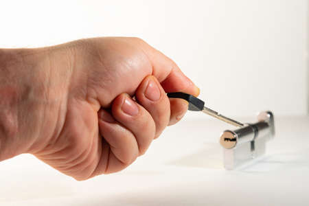 A flat key in the fingers of the hand, pointing towards the keyhole. Keyhole, lock larva, flat key and palm, on a light background.