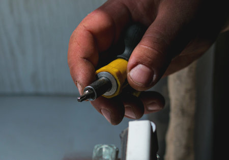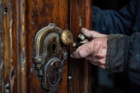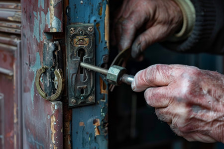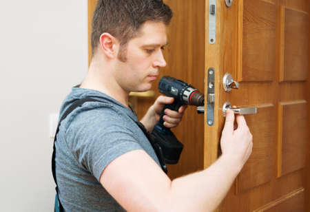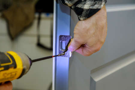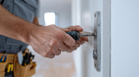 A handyman uses a screwdriver to install a door lock in a modern interior. This image showcases skilled craftsmanship and the attention to detail in home repairs.
