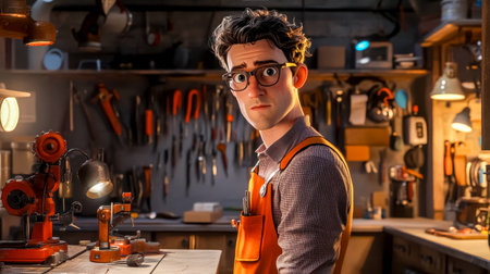 Craftsman wearing an orange apron and glasses is working in his workshop, surrounded by various tools hanging on the wall, with a focused expression as he engages in his craft