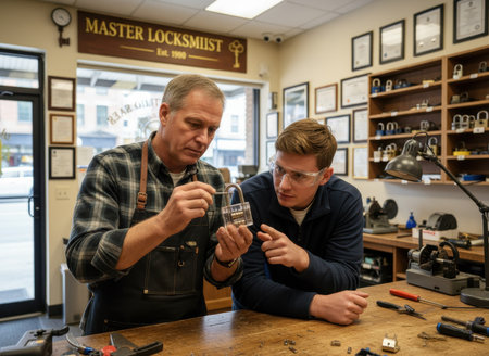 In a locksmith shop, an experienced locksmith explains how a padlock works to a young student. Tools and locks are scattered on the workbench, creating a focused learning environment.