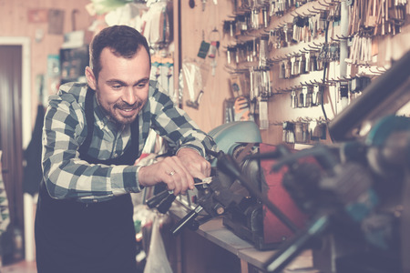 Young friendly smiling male worker using his tools for repairing in specialized workshop