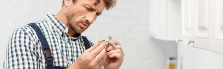 Panoramic shot of handsome plumber holding handle of faucet while working in kitchen