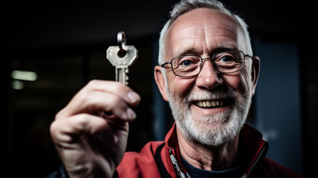 The key is clenched in the fingers of the hand, the keyhole in the background. The key to the cherished home is in your hands, before opening the cherished lock.