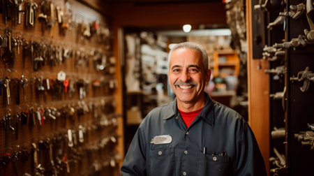 The picture of the locksmith working inside the workshop that has been filled with keys and work tools, the locksmith need the knowledge of the various type of lock and key to working this job. AIG43.