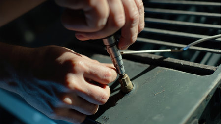 Close-up detail of a mechanic's hands expertly using a specialized tool to repair a vehicle component. Focus on precision and skilled craftsmanship in an auto repair workshop setting. Illustrates professional automotive maintenance and repair services.