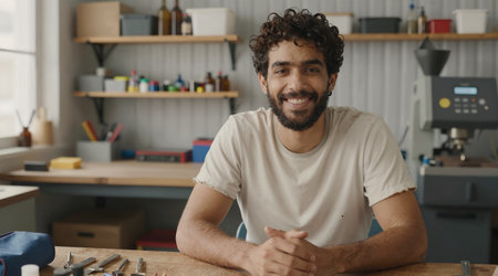 Portrait of handsome young African American man with curly hair looking at camera and smiling while sitting at table in workshop