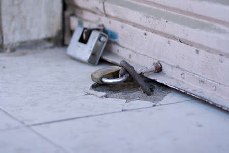 old wood facade home and rusty safe padlock