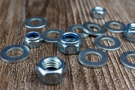 bolts, nuts, washers on a wooden background, tools on wooden texture