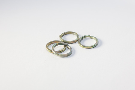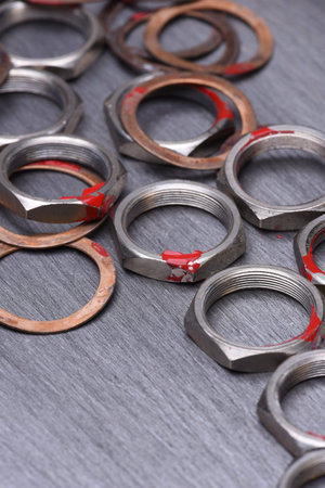Old washers and spring washers with an isolated old wooden background for commercial use are used, copy space.