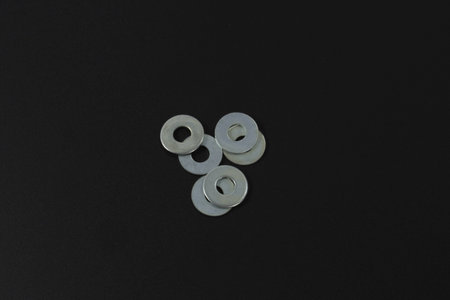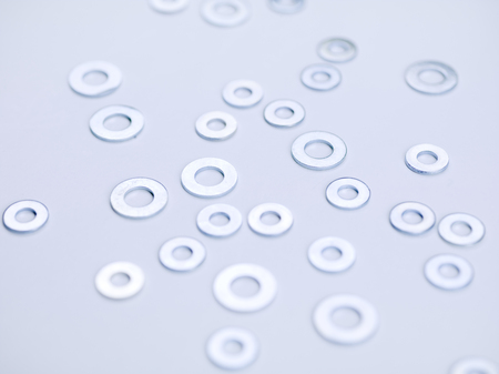 Metal washers on a blue bright background. Technical spare part with geometric shape. creative engineering concept