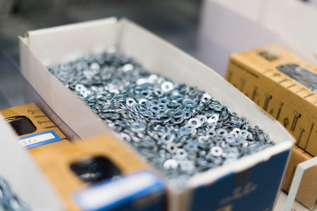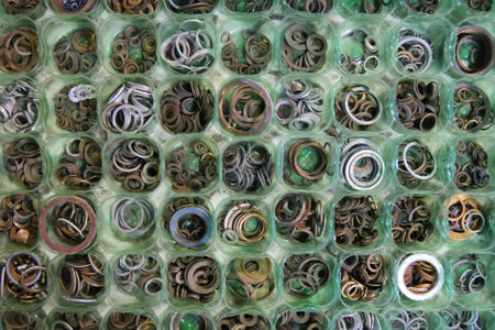 A lot of metal washers in a transparent box. Storage of fasteners and parts in a cell