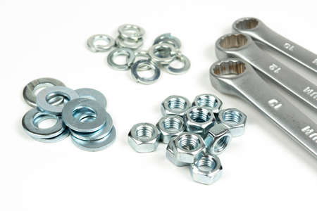 several groups of metal washers and nuts in silver color with wrenches on a white background. close up