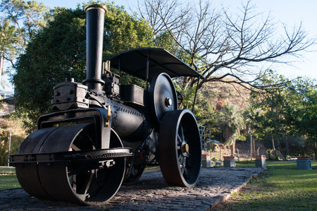 the ancient engine standing on rails which it is used as an example