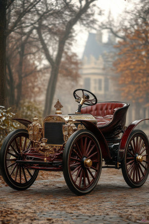 A vintage car with intricate detailing stands on a path covered with fallen leaves. Surrounding trees display autumn colors, creating a serene atmosphere on a misty day.