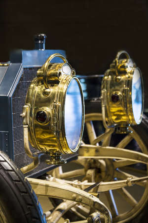 Gold headlight of modern prestigious retro car close up.