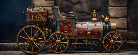 An antique steampunk vehicle with oversized wheels trapped in a narrow alley. Concept Steampunk Vehicle, Antique, Oversized Wheels, Narrow Alley, Trapped