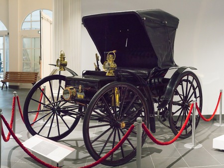 STUTTGART, GERMANY - OCTOBER 18, 2025: Early Daimler motor vehicle from 1899 at the Mercedes-Benz Museum. Historical transition from horse carriage to motorized transportation