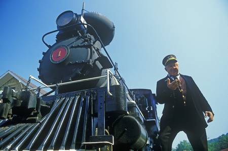 A steam engine conductor checks the time as he stands near the cowcatcher on the front, Eureka Springs, Arkansas