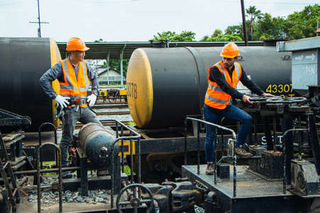 Inspector Engineering wearing helmet and vest worker unifrom checking railway construction work on rail track. Asian workers and coworkers stand beside old train bogies.