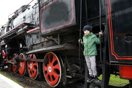 Handsome man tourist inside of a classic vintage old retro train steam locomotive in the Railway engineering museum in Leninskiy Rayon Brest Belarus.