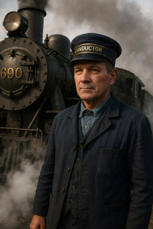 Conductor in classic uniform standing beside a powerful steam locomotive, with smoke rising in the background